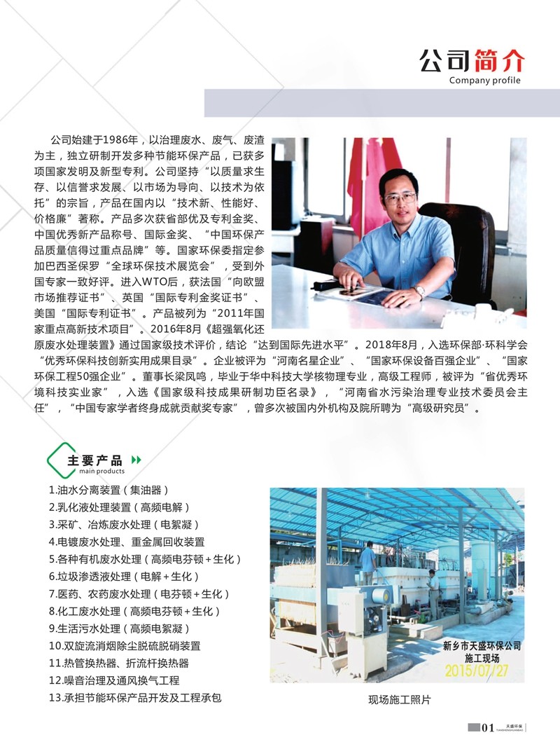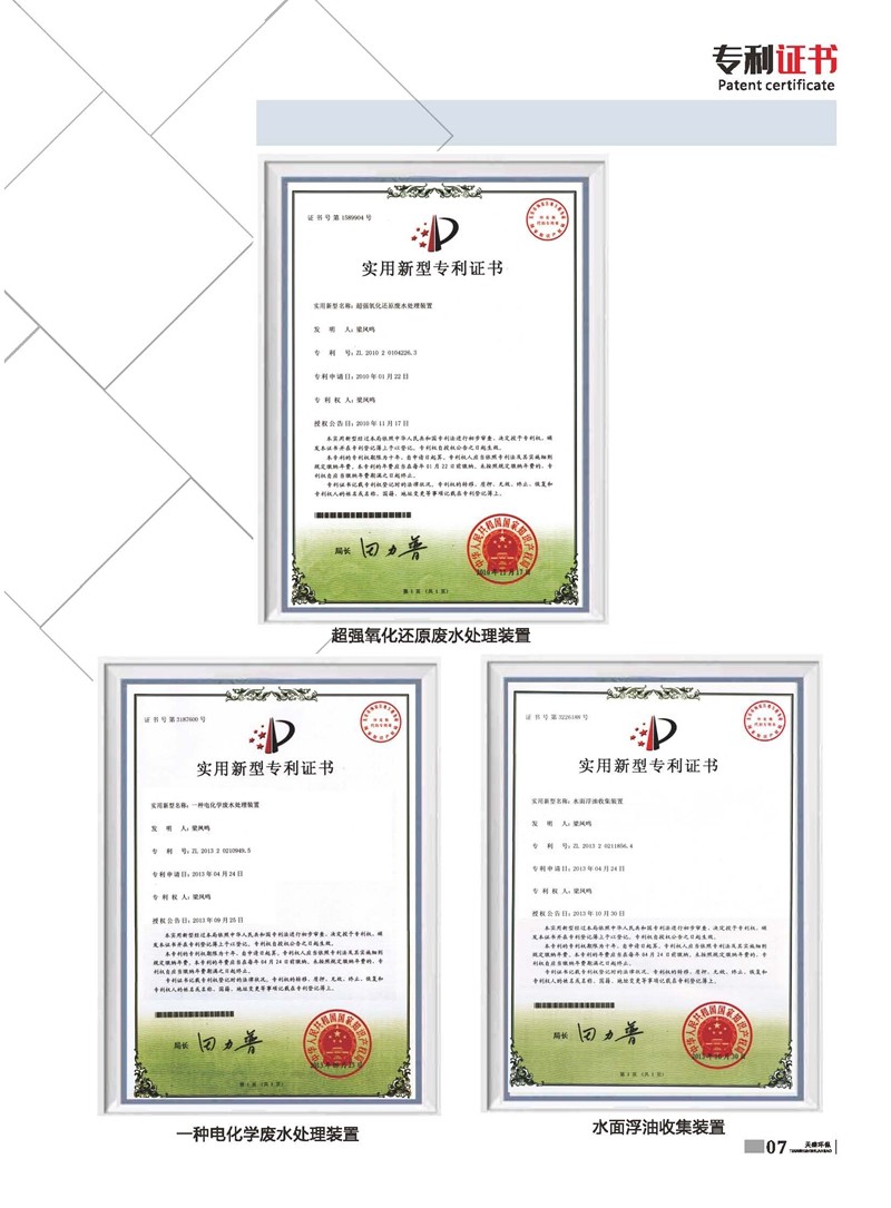 以治理廢水為主,獨立研制開發多種節能環保產品,已獲多項國家發明及新型專利水面浮油收集裝置 ZL 2013 2 0211856.4。公司堅持“以質量求生存、以信譽求發展、以市場為導向、以技術為依托”的宗旨,產品在國內以“技術新、性能好、價格廉”著稱。
