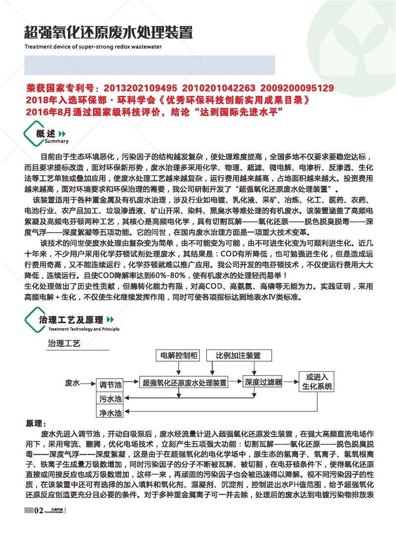 公司始建于1986年,以處理各種有機廢水、各種重金屬廢水為主,獨立研制開發多種節能環保產品,已獲多項國家發明及新型專利一種電化學廢水處理裝置 ZL 2013 2 0210949.5。公司堅持“以質量求生存、以信譽求發展、以市場為導向、以技術為依托”的宗旨。